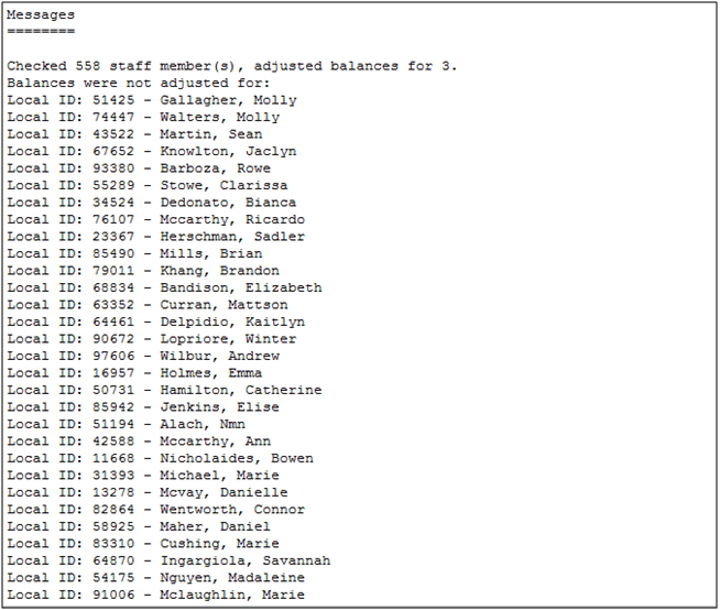 The procedure creates one accrual record to balance the accrual type (sick, vacation, etc.) for staff and lists how many records have been affected, but it does not display the results for each staff member.
