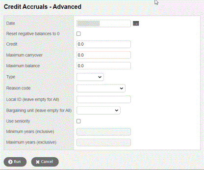 4. From the Options menu, click Run. The Credit Accruals – Advanced pop-up appears.
