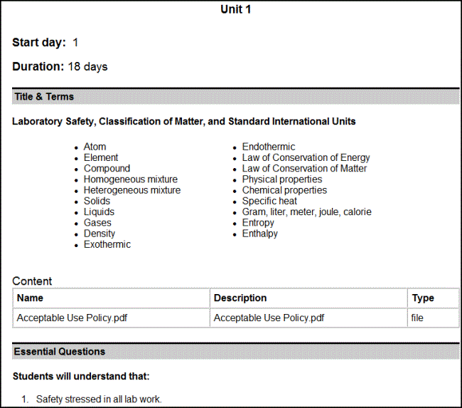 View and/or print the curriculum map designed for a course you are teaching to see the course in its entirety or just a particular unit.