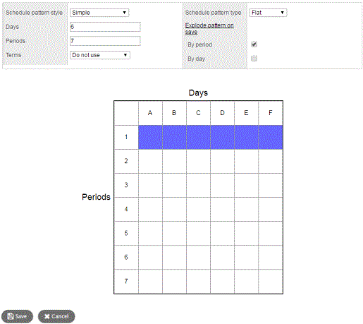 Note: After you identify the pattern, click Save. If you selected to explode the pattern, the system uses the one period/day combination that you map on the grid to create every possible matching pattern within the schedule on the list of patterns available on the Pattern Library side-tab. |